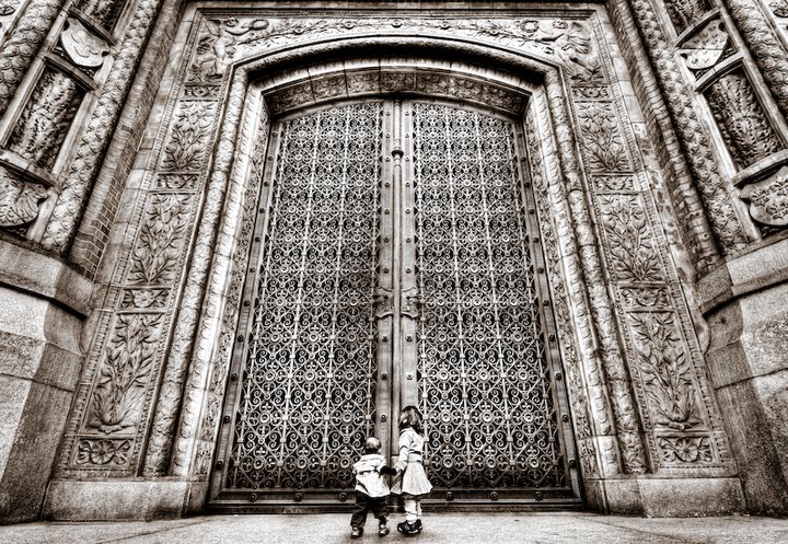 Bērni pie baznīcas durvīm